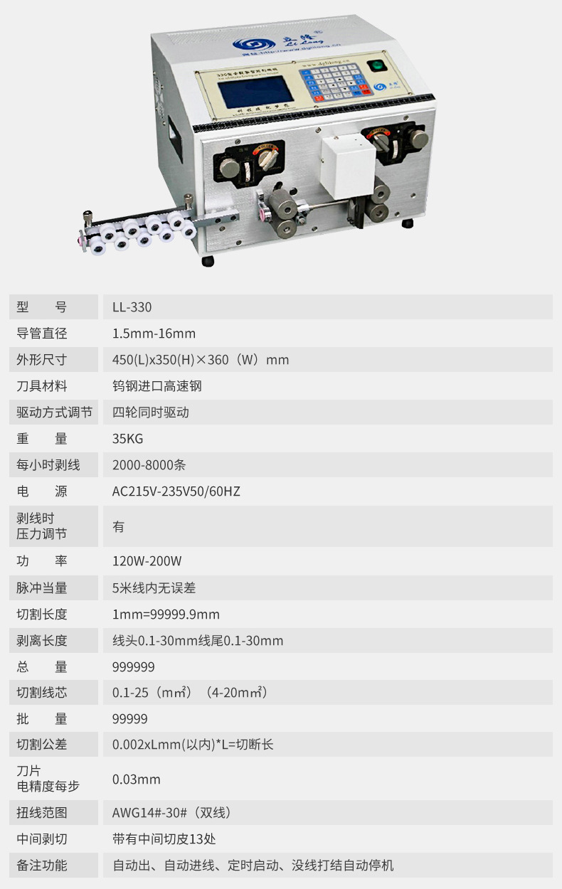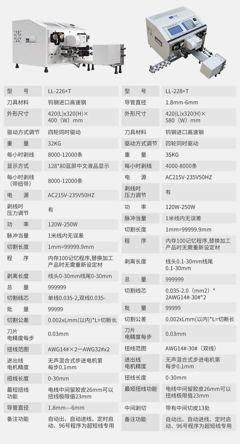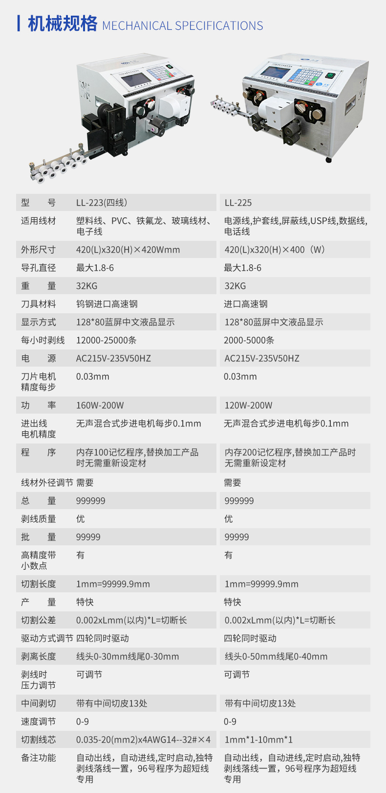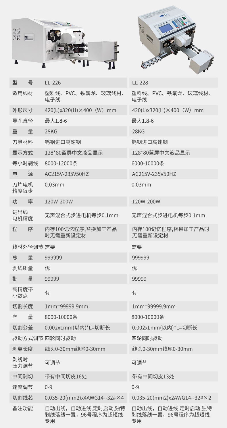 LL-223全數字智能剝線(xiàn)機(電機開(kāi)排型) 產(chǎn)品說(shuō)明: 1.本機采用藍屏中英文轉換顯示,數字智能控制裝置,按鍵操作,性能穩定,操作方便。 2.機臺設計非常靈活性,針對雙并線(xiàn)、排線(xiàn)、平行線(xiàn)、RVB線(xiàn)等;全自動(dòng)分線(xiàn)、裁線(xiàn)、...