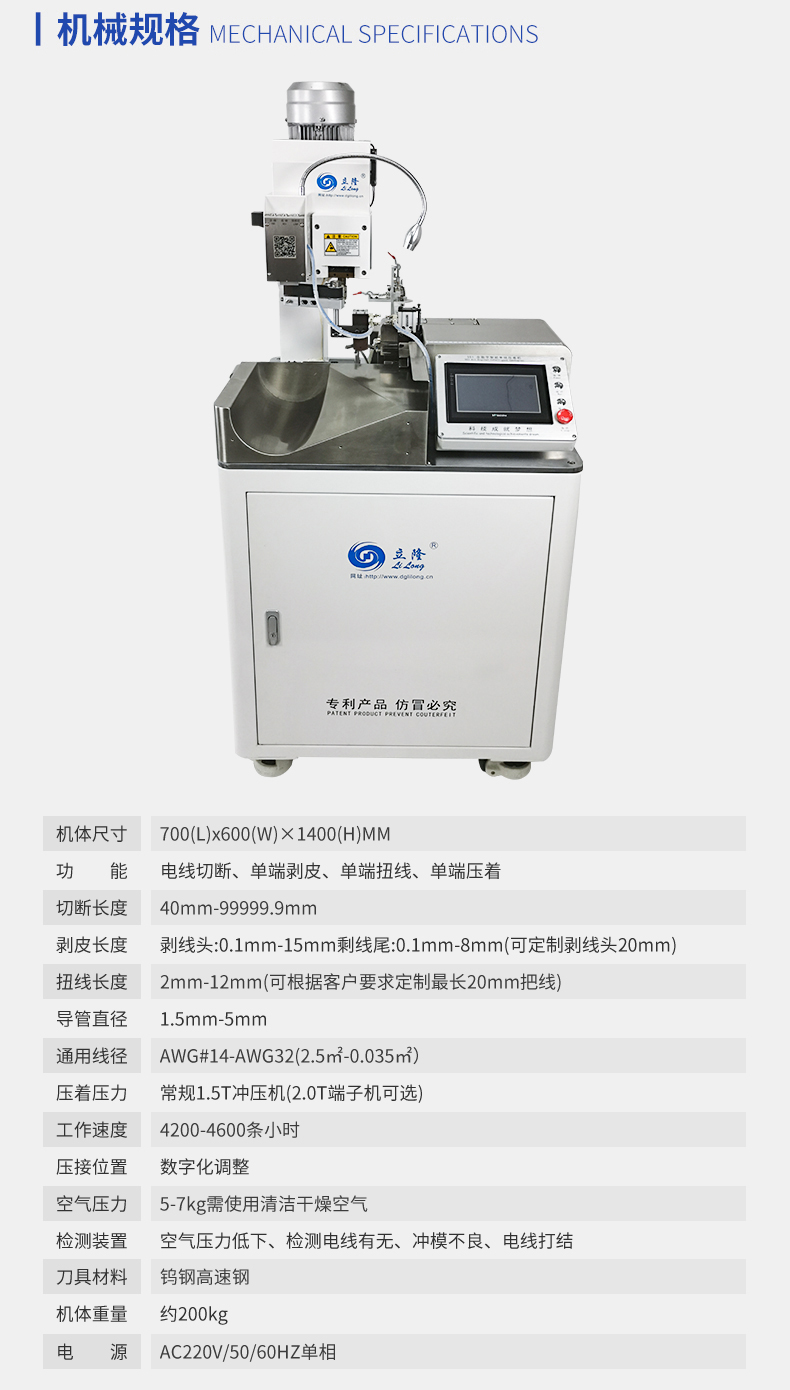 LL-551/551+T(帶扭線(xiàn))全數字智能單端壓著(zhù)機 產(chǎn)品說(shuō)明: 1.精巧,緊湊的設計,極佳人性化設計,占地面積小。 2.數字智能觸摸屏和按鍵中文操作菜單易學(xué)易用。 3.可儲存100套加工程序,更換工序和材料...